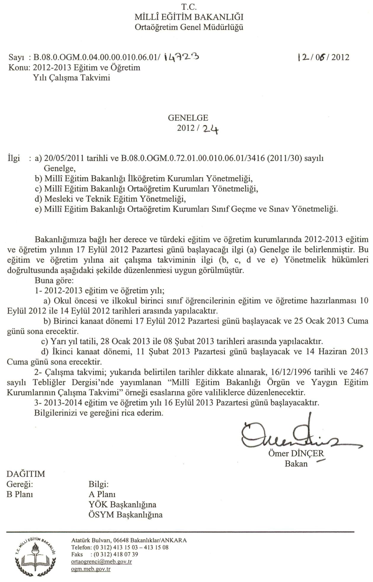 İkinci dönemin ders başlangıcı ise 11 Şubat 2013′te başlayacaktır,  ve okullara 14 Haziran 2013′te ikinci dönemki eğitimi de bitirip yaz tatiline gireceklerdir
