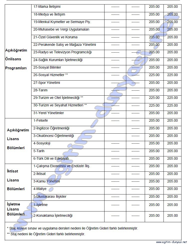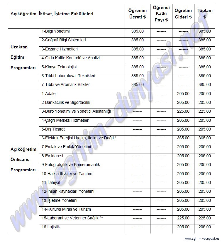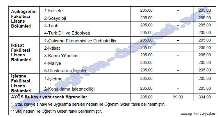 TABLO 2-AÇIKÖGRETİM , İKTİSAT, İŞLETME FAKÜLTELERİNE 2012-2013 ÖĞRETİM YILINDA YATAY GEÇİŞ İLE KAYIT YAPTIRACAK ADAYLARIN ÖDEYECEĞİ ÖĞRETİM GİDERİ VE ÖĞRENCİ KATKI PAYI TUTARLARI