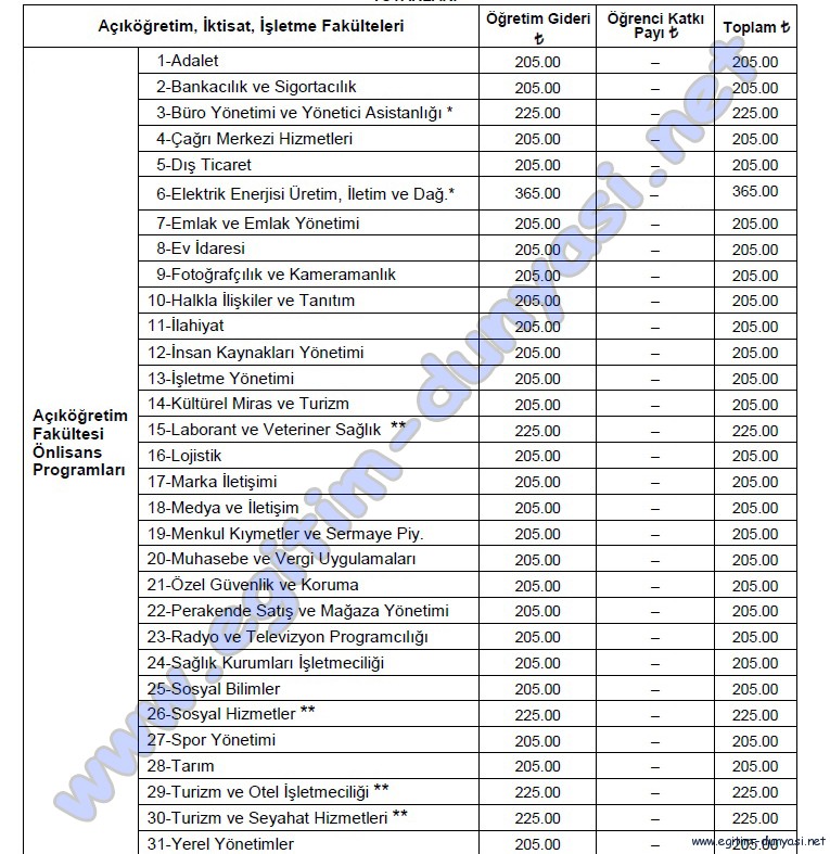 Aöf (açıköğretim) 2012-2013 harç, Katkı payı miktarları (Detaylı)