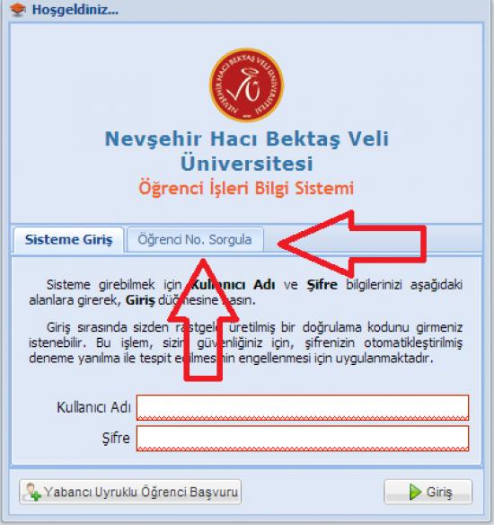 – http://ubs.nevsehir.edu.tr sisteme giriş yapmak için tıklayınız. Açılan sistemden “Öğrenci No Sorgula” butonuna tıklayınız.