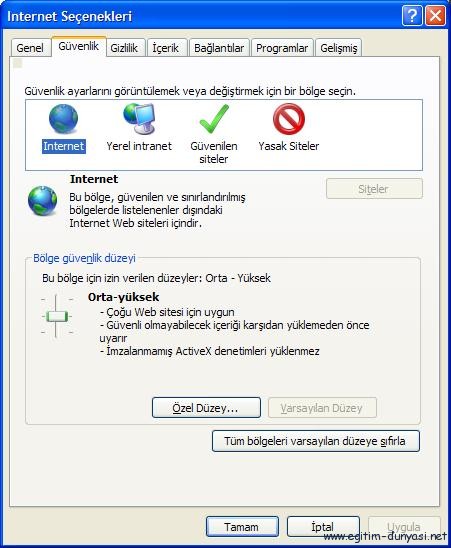 Bu pencereden Güvenlik (Security) sekmesini tıklayınız. Internet bölgesi seçili iken (ki otomatikman bu bölge seçili gelir), Tüm bölgeleri varsayılan düzeye sıfırla düğmesini tıklayıp Tamam (OK)’a basarak çıkınız.