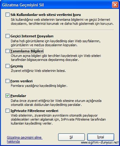 Karşınıza gelen Gözatma Geçmişini Sil başlıklı pencerede sadece Parolalar seçeneği onaylı iken Sil düğmesine tıklayınız. Kısa bir süre sonra tekrar gelecek Otomatik Tamamlama Ayarları başlıklı pencerede Tamam düğmesine tıklayınız ve en son olarak da açık kalan Internet Seçenekleri başlıklı pencerede Tamamdüğmesine tıklayınız. egitim-dunyasi.net olarak sorularınızı ve merak ettiklerinizi yazımıza yorumlarınızı bekliyoruz